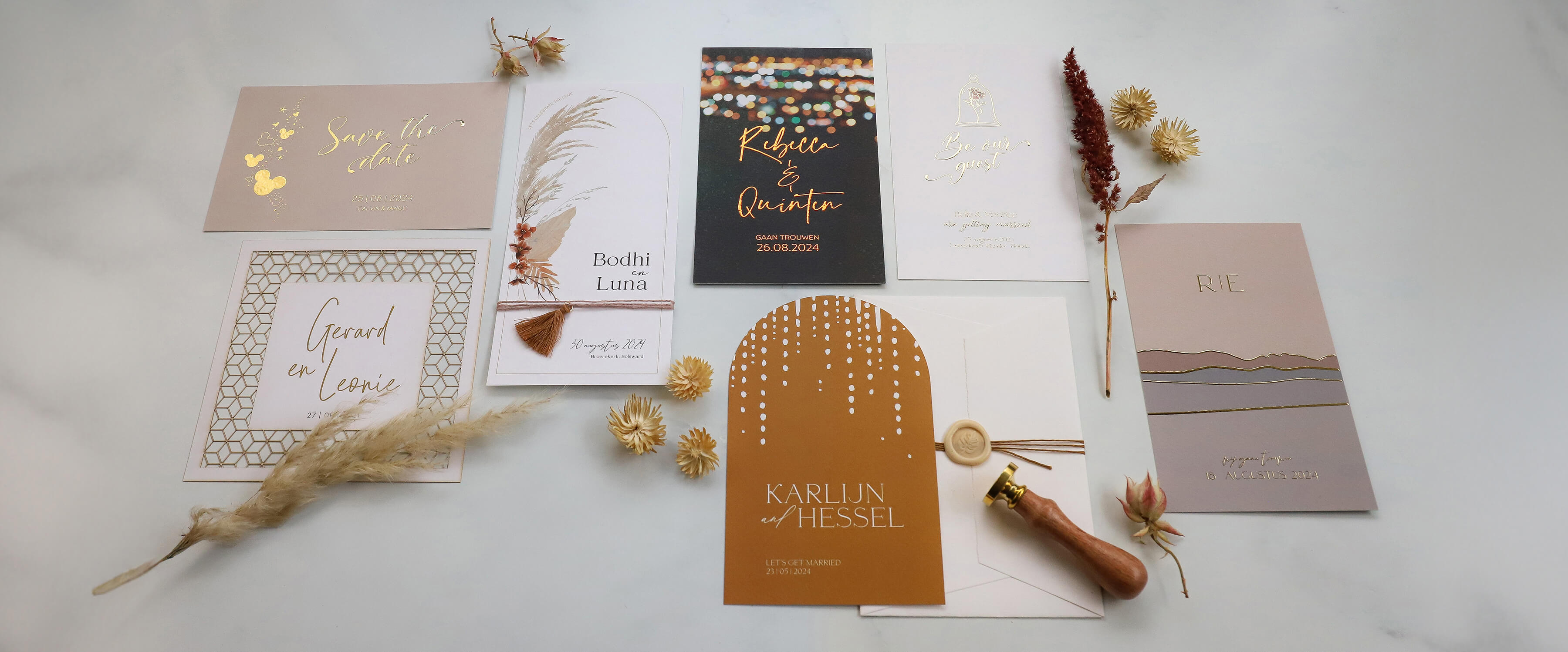 De save the date kaart of trouwkaart is het allereerste wat de gasten van jullie bruiloft te zien krijgen. Met onze unieke kaartjes en stationery nemen jullie ze mee in een overgetelijke belevenis en zorgen jullie ervoor dat ze zich echt speciaal zullen voelen. Combineer jullie trouwkaart met mooie labels, sluitstickers en envelop tot een cadeautje in de brievenbus. Met een bijpassende menukaart, naamkaartjes, welkomstbord, en stickers voor op de bedankjes maken jullie de trouwbeleving helemaal compleet. Kies een kaartje uit een van onze collecties en bewerk die heel makkelijk zelf met onze handige online kaartjes bewerker. Liever een kaartje op maat? Wij kunnen als grafisch vormgevers een bijzonder ontwerp voor jullie maken!