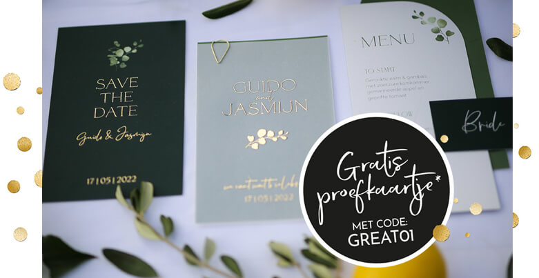 Meer over onsGraag willen we je laten zien hoe mooi onze kaartjes er in het echt uitzien! En daarom geven we je één proefkaartje gratis!* Zodra de kaart helemaal naar wens is bestel je de proefkaart en vul je in het winkelmandje de actiecode GREAT01 in. Bestel je op werkdagen voor 12 uur dan wordt het kaartje dezelfde dag nog gedrukt en verzonden.