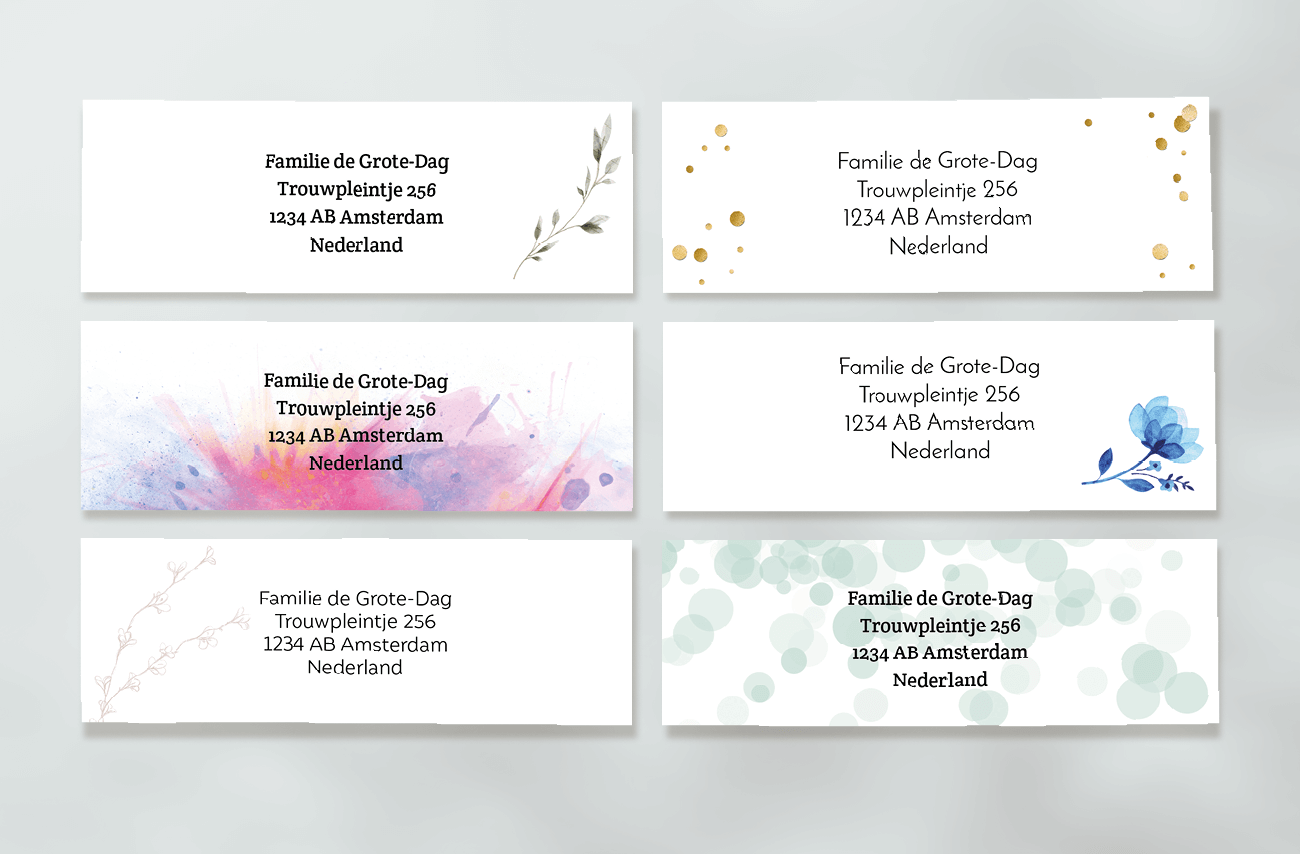 Superhandig zijn ze: onze adresetiketten! Je plakt ze makkelijk op de enveloppen en de kaartjes kunnen zo op de post. En het leuke is dat we voor elk kaartje wel een bijpassend etiket hebben. Zo hebben jullie alles helemaal in één stijl.