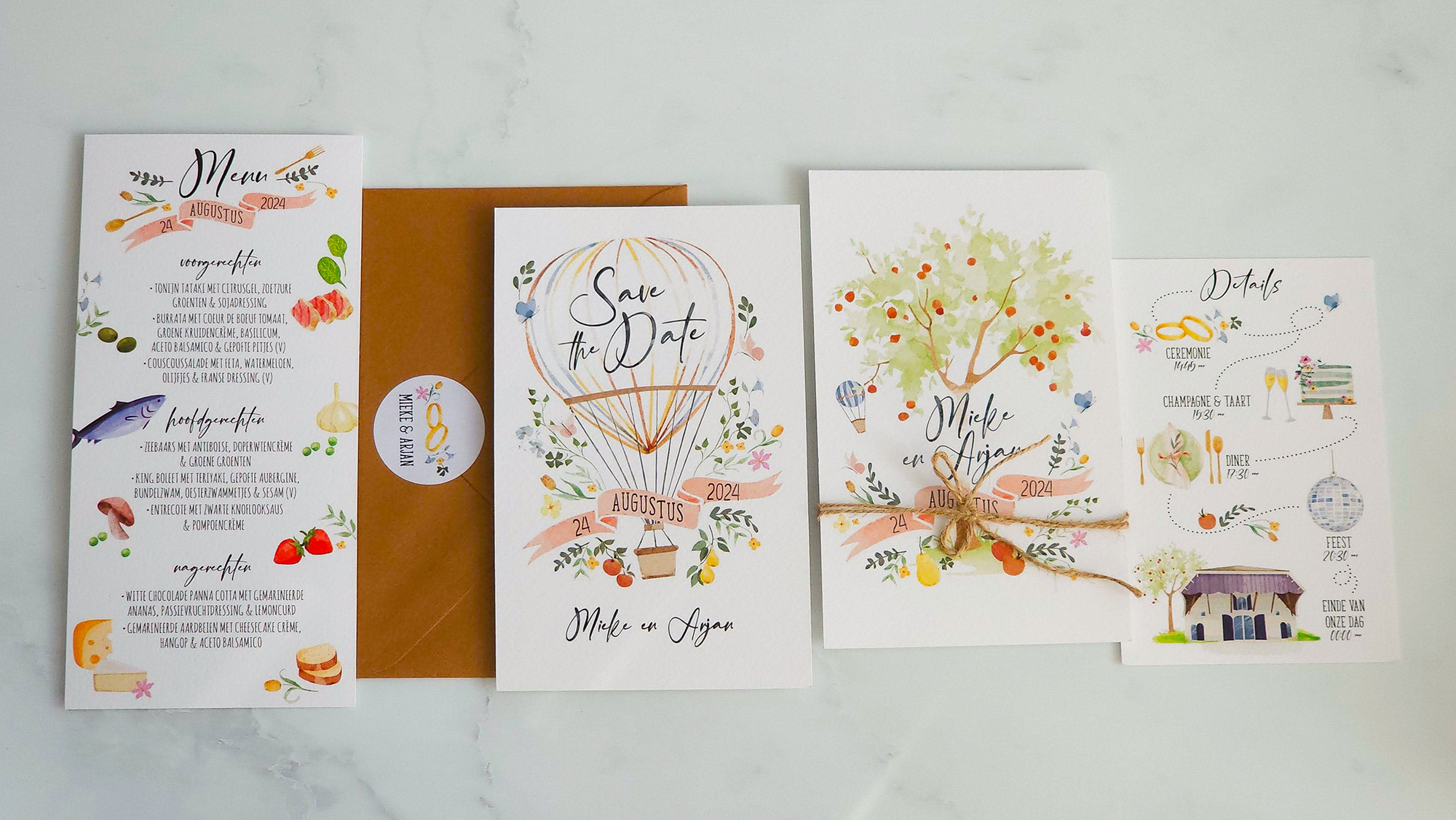 Zodra we alles van jullie hebben ontvangen, gaan we aan de slag. Meestal beginnen we met de save the date of de trouwkaart. Wanneer we de ontwerpen klaar hebben sturen we jullie een paar voorstellen via e-mail, waaruit jullie kunnen kiezen. Dan gaan we het ontwerp finetunen, zodat het uiteindelijk helemaal naar wens is. We voeren het ontwerp vervolgens kosteloos door in eventuele andere producten, zoals menukaarten, naamkaartjes, stickers, etiketten, trouwbeloftes, kinderakte, het welkomstbord, gastenboek en nog veel meer. Vanzelfsprekend betalen jullie dan wel voor de drukkosten daarvan.